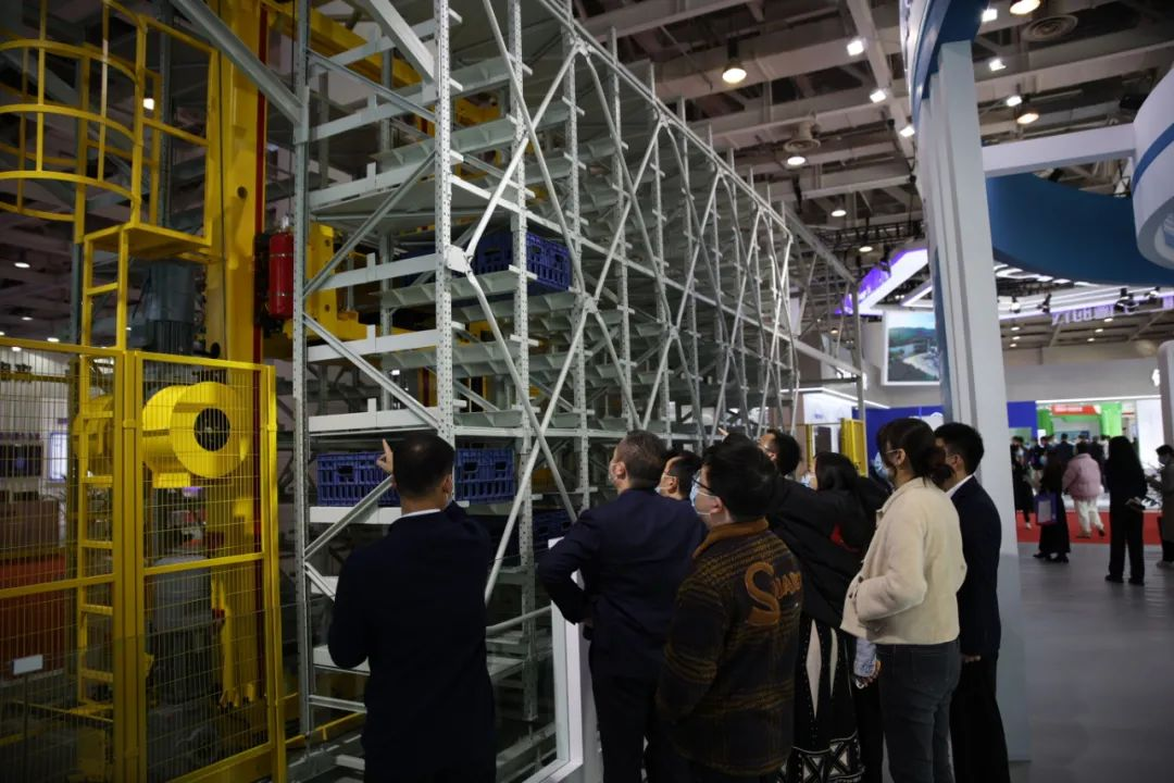现场观众参观精实机电展品——有轨巷道堆垛机(RGV)