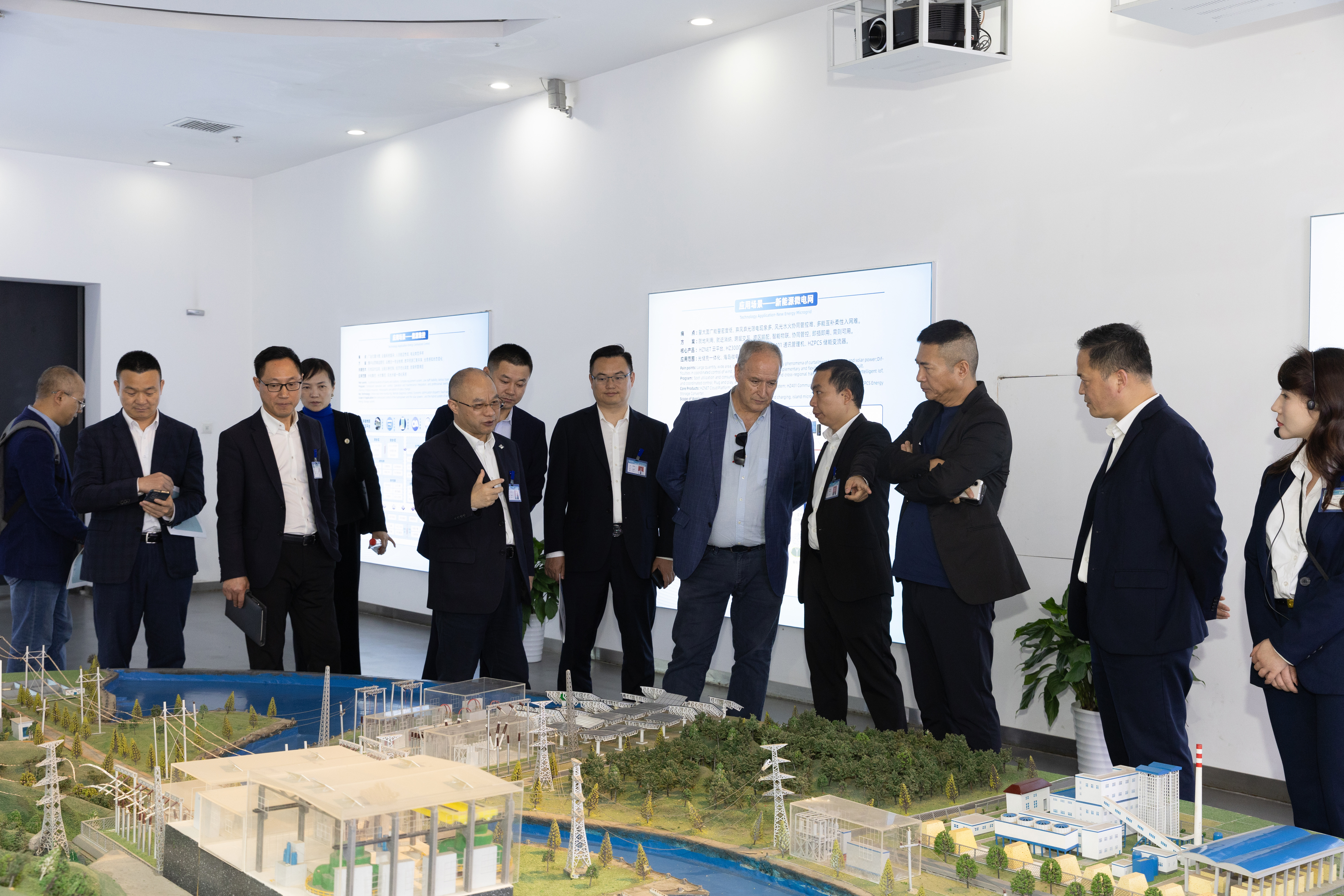 来宾一行先后参观了公司展厅、多能物联数据中心、新能源微电网示范站、零碳小屋、源网荷储系统实验室和生产车间,全面了解公司技术、产品及市场开拓情况,对公司多能物联技术创新成果、核心发展优势等给予高度评价。