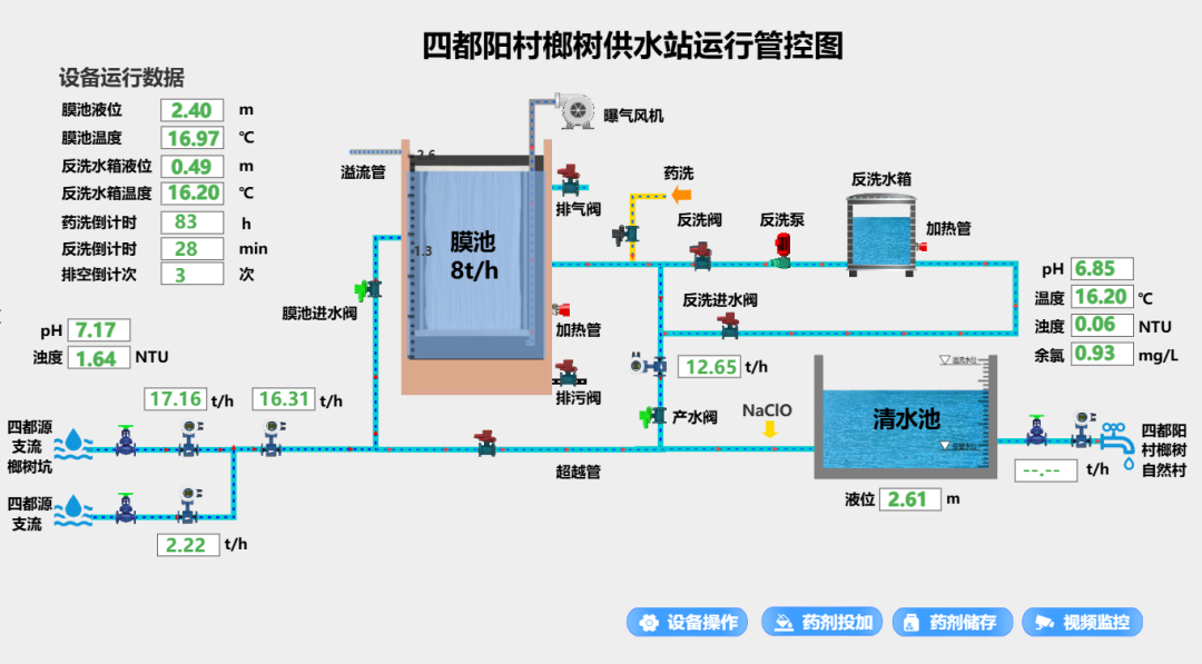 HZI-RW农村供水数字化综合管理平台,实现了217座单村水站水位、水量感知元件全覆盖,50人以上水站实现水质在线监测、视频监控;可实时掌握水量水质及设备运行数据,供电、通讯情况,视频监控等;实现远程加药调整、设备操作。