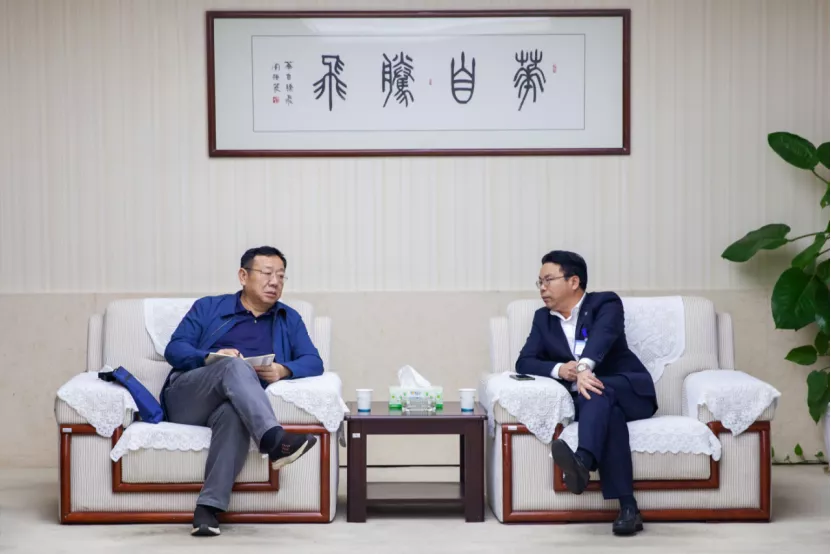 湖南省生态环境厅党组副书记、副厅长刘群(左)认真听取公司总裁佘朋鲋汇报公司概况