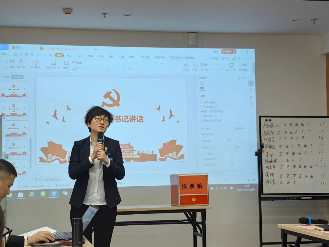 公司党委副书记胡兰芳代表上一届党委向大会作工作报告,从思想引领、党员队伍建设,组织文化、社会责任等方面对党建工作做了总结。大会根据《中国共产党章程》、《中国共产党基层组织选举工作条例》,经过选举动员、协商酝酿、民主投票等程序选举产生新一届党委班子,黄文宝当选为党委书记,胡兰芳当选为党委副书记,李平、刘国庆、卢志娟、芦敏红、孙彦吉当选新一届党委委员。