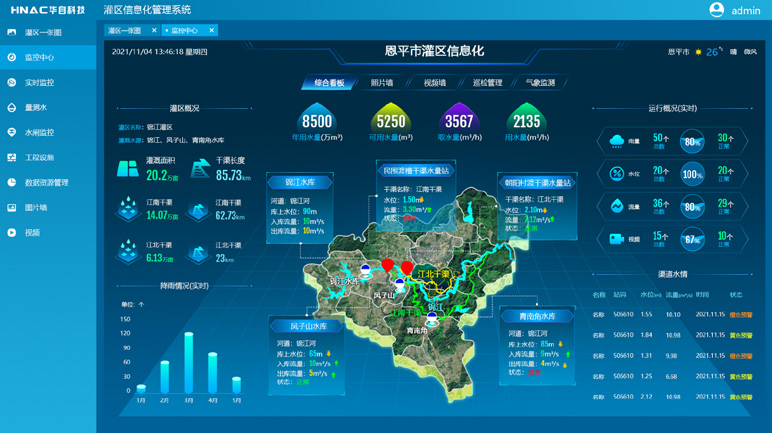 基于 GIS 地理信息、视频监控、传感器、自动化控制、物联网、5G 等技术综合采集监测灌区的水雨情、工情、气象、 墒情等信息,以统一的数据平台方式为灌区水资源合理调配、防汛抗旱提供及时、准确、可靠的信息,实现水闸、泵站、 量水设施等工程的综合监视、测量和远程控制,实现灌区渠道水情实时测报、水量计量自动化、水闸自动化控制、泵站 及泵站群远程监控、水资源调配自动化、水质动态监测等功能,有效提高灌区管理的快速反应能力、科学决策水平和管 理效率。