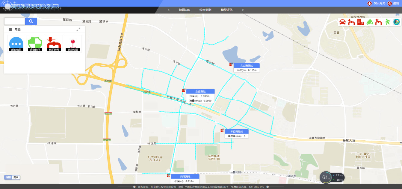 Ø 对井盖在内的排水设施进行统一管理,同时接入地下管网并模拟积水等深线,辅助内涝防治。
