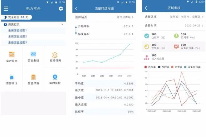 支持手机APP:基于安卓系统/IOS系统开发,主要为系统各级使用人员提供移动办公服务。通过手机APP随时查看各市级行政区域生态流量达标数据,同时可以查看各站址下泄流量实时数据与历史数据。