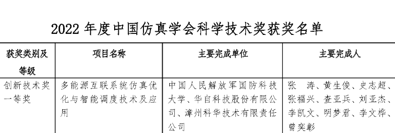 8月4日,中国仿真学会发布《2022年度中国仿真学会科学技术奖获奖名单》,由国防科技大学、江南平台(中国)科技、漳州科华技术有限责任公司合作完成的“多能源互联系统仿真优化与智能调度技术及应用”项目荣获中国仿真学会科学技术奖-创新技术奖一等奖。