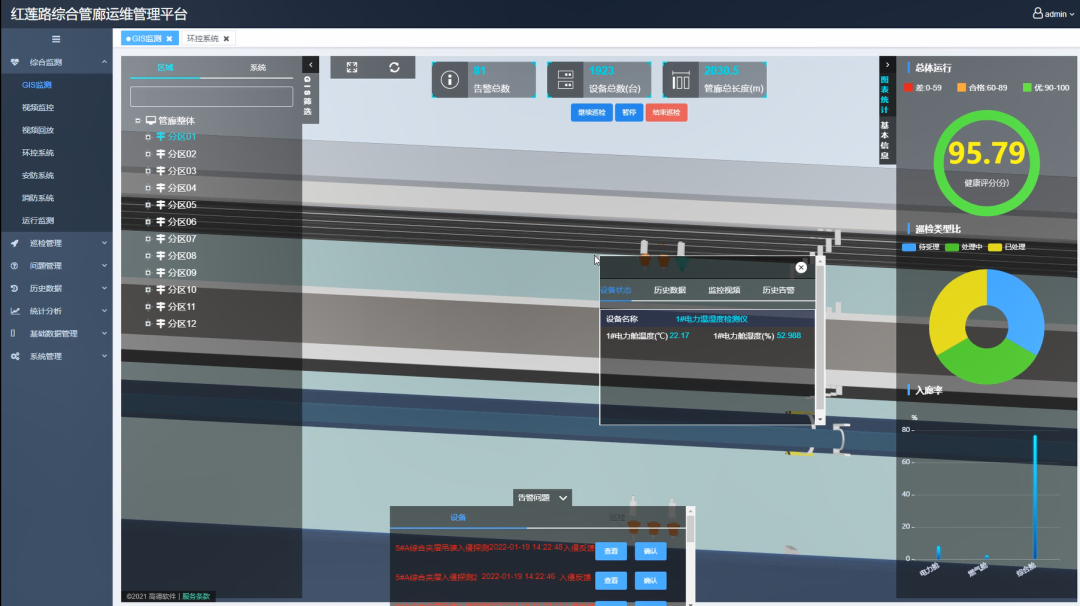 江南平台(中国)科技研发的HZInfo3000_UT综合管廊监控管理平台完美破解综合管廊管理的压力与难题,该平台充分利用云计算、物联网、GIS+BIM、大数据等高新技术,集环境设备监控、安防监控系统、通信系统、消防监控系统、巡检管理、设备管理、出入廊管理系统为一体,实现对管廊的集中管理和统一控制,保障管廊安全、高效、规范运行。