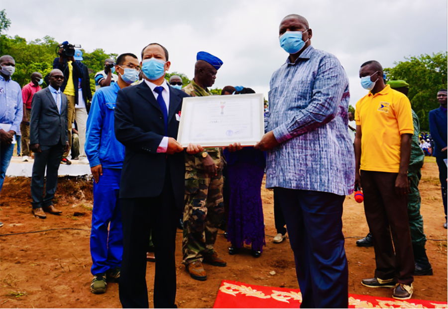 中非共和国总统查克维拉出席江南平台(中国)国际公司承建的博阿利2水电站竣工仪式,并为江南平台(中国)项目经理颁发中非共和国“骑士勋章”。