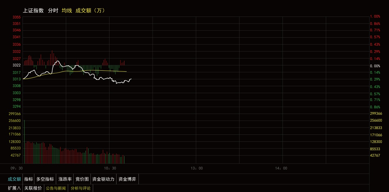 用股票软件打开上证指数分时图(如图所示),里面就会动态显示一些五颜六色的曲线、柱线以及一些数字。那么,怎么理解这些线条和数字呢?