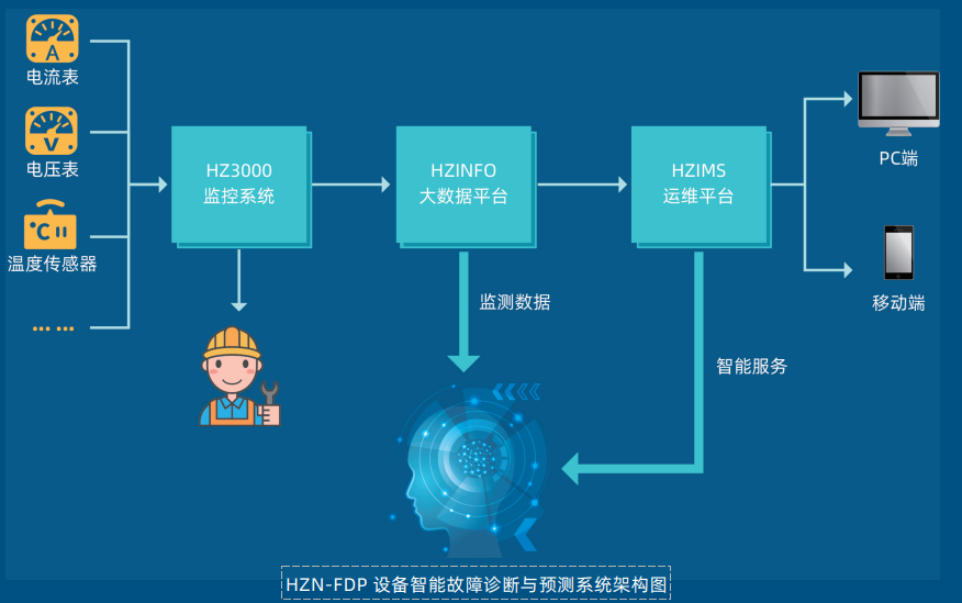 HZN-FDP 设备智能故障诊断与预测系统针对水电站、泵站等远程控制、集中控制、智能控制的 需求,采用知识图谱、机器学习等人工智能技术形成故障诊断与预测模型,通过实时在线监测和预 警分析,实现设备故障的早发现、快解决,排查隐患,全面保障高效、安全生产。该系统成功入选 长沙市新一代人工智能开放创新平台,目前已在多个水电站投入应用,协助用户完成智能化转型升级, 实现智能、高效运维。